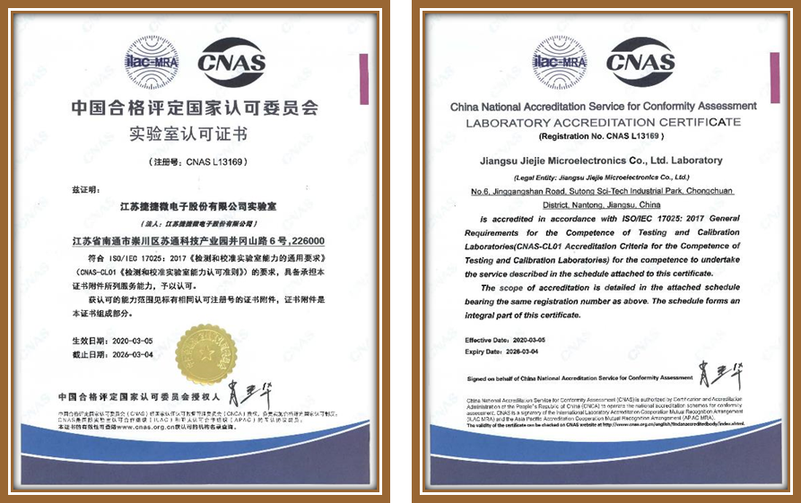 江蘇捷捷微電子股份有限公司實(shí)驗室測試中心,提供多種可靠性試驗,包括環(huán)境可靠性測試、板級可靠性試驗,使用壽命可靠性測試和全方位的失效分析服務(wù)。 捷捷微電子股份有限公司實(shí)驗室已經(jīng)獲得中國合格評定國家認可委員會(huì )的實(shí)驗室認可證書(shū)(CNAS認證) 江蘇捷捷微電子股份有限公司實(shí)驗室測試中心成立于 2011 年,分南通、啟東、深圳3個(gè)測試場(chǎng)地?,F有工作人員50名,其中管理人員 5 名,檢測人員 45名,簽字授權人4名,中級職稱(chēng)人員2名,助理職稱(chēng)人員6名,本科學(xué)歷人員21名。實(shí)驗室占地面積2000平方米,南通1200平方米,啟東800平方米。2018年8月發(fā)布并實(shí)施實(shí)驗室管理體系,并在2020年3月取得CNAS實(shí)驗室認可證書(shū)(L13169)。實(shí)驗室現有各類(lèi)設備近170臺,可開(kāi)展可靠性試驗項目20余項,浪涌過(guò)電壓檢測項目10余項,失效分析10余項以及特性測試等項目。與中科院微電子所、西電、中車(chē)等單位存在長(cháng)期合作關(guān)系。